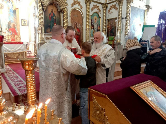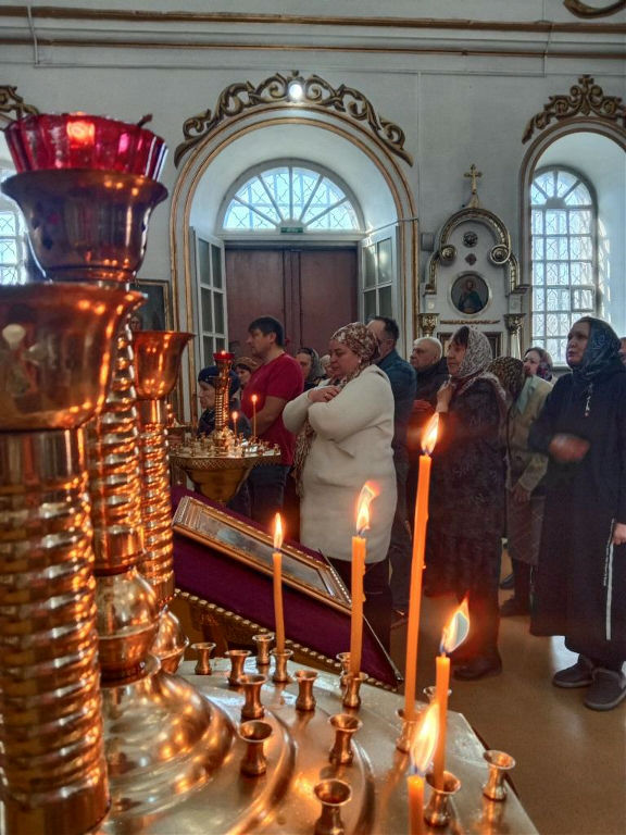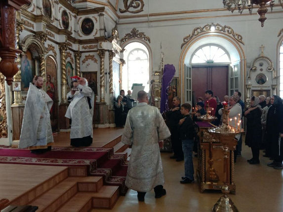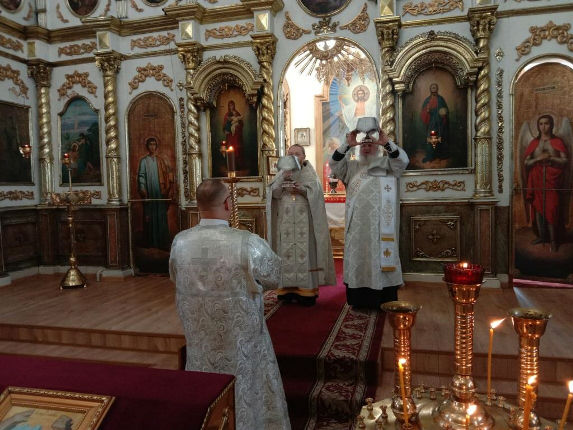 Вечернее богослужение и Божественную литургию в храме Воскресения Христова совершил иерей Евгений Хохряков в сослужении протодиакона Николая Белоконь.