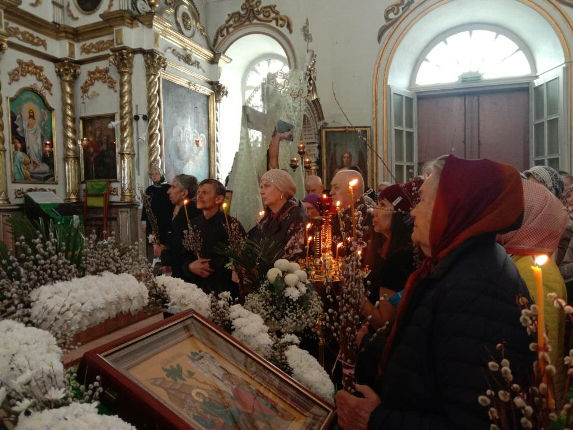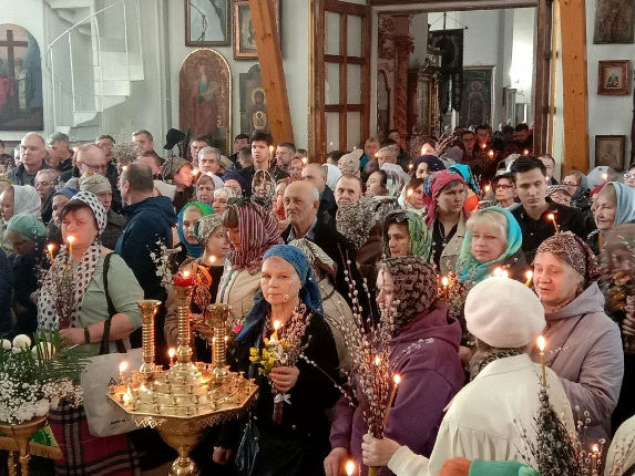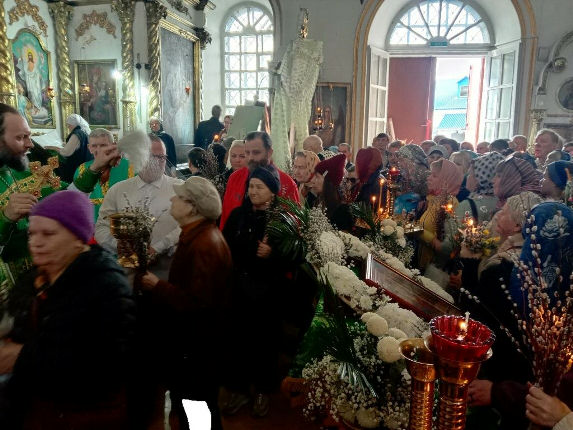 Уже на повечерии в субботу священники освящали вербы и радостно окропляли верующих святой водой! Сегодня это снова происходило, церковь была полна народа. Все держали в руках свечи, вербы, украшенные цветами. И храм едва мог вместить всех желающих принять участие в этом праздничном богослужении. Было очень много и причастников.