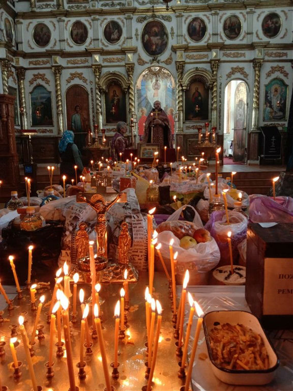 По традиции в центре храма устанавливают стол, на котором прихожане размещают свои приношения, а также коливо для поминания своих усопших родных и всех от века почивших православных христиан.
